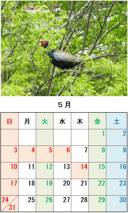新緑の木々の間から鳴く雉、日本の国鳥で、昔話では桃太郎と一緒に鬼退治をしました。何故、桃太郎の家来は「申(猿)・酉(鳥=雉)・戌(犬)」だったのでしょうか?鬼は北東=丑寅=鬼門の象徴。その鬼を倒すには裏鬼門(南西~西~北西)の力が必要。そこに並ぶ十二支が申・酉・戌だからという説が有力です。