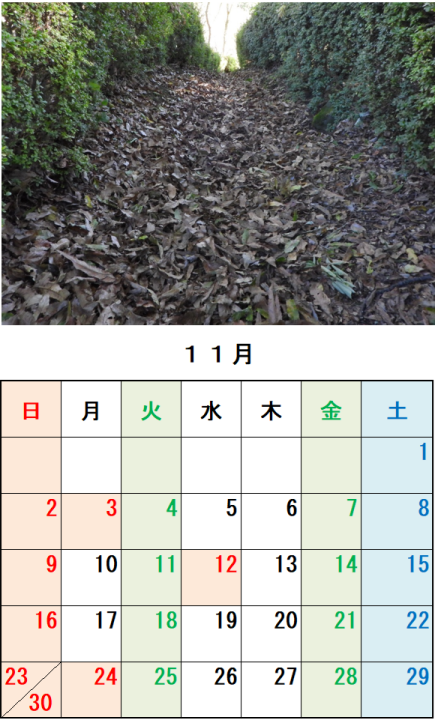 小室山公園内の小道、秋になると枯れ葉が積もり、良い雰囲気の散策路になります。小室山は、元々大室山と同じような草山でした。1962年頃、景観を整えるため本格的な植林が行われ、今の姿になったのです。さらに、近年は山頂にループ状ボードウォーク「MISORA」を整備、カフェも併設され若い女性で賑わっています。